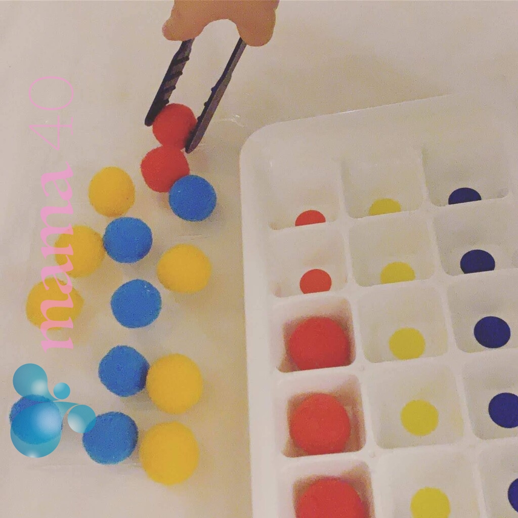 遊び方:最初は、大人がやって見せてあげたらよいと思います。トレーにポンポンを全部出して、それを一つづつ、指でつまんで入れていく。2歳半くらいになるとトングも使えるようになります。わが家ではこどもちゃれんじぷちの教材で届いたトングを利用しました。