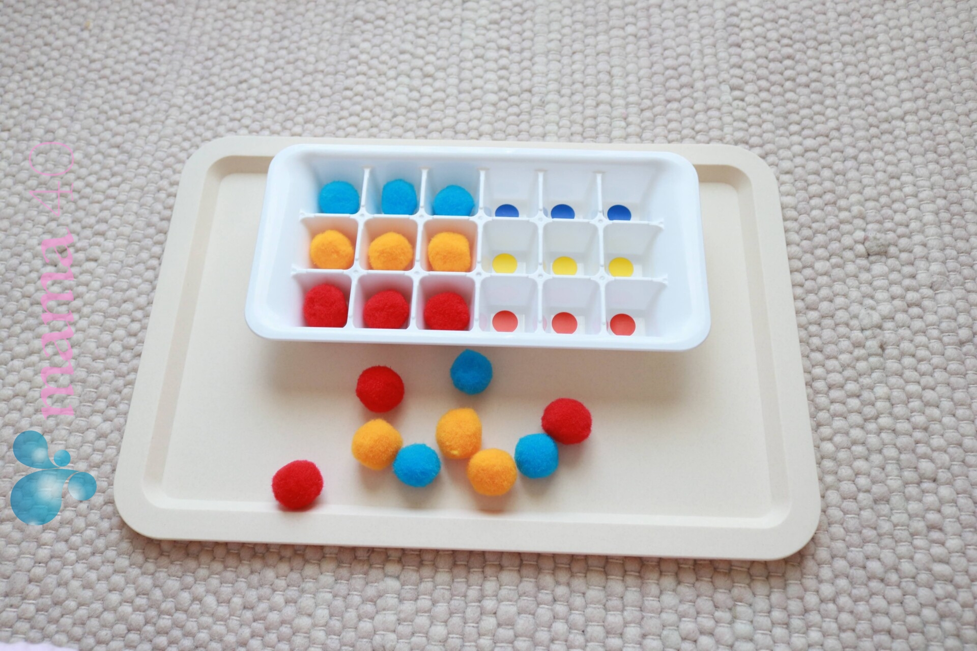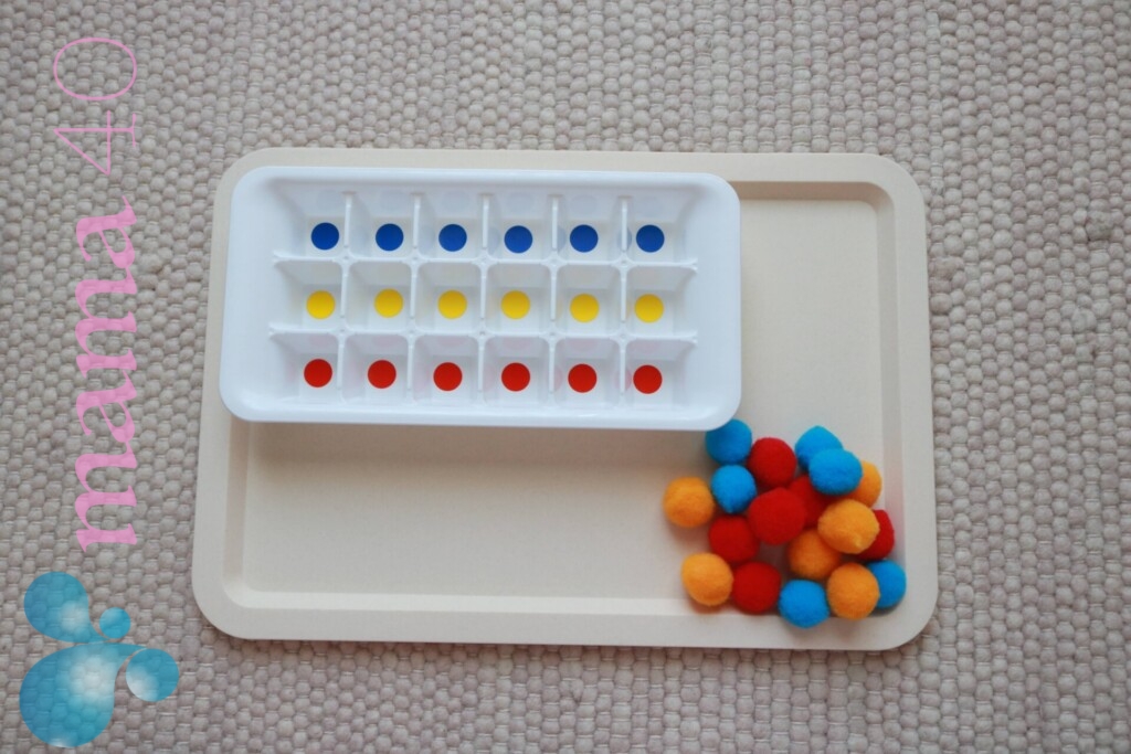 100均で揃えるアイテム:製氷皿、ポンポン、丸シール(色は、三原色の、赤、青、黄色、がオススメです)