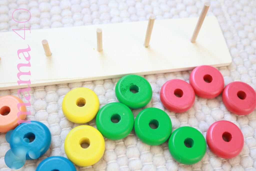 手指をたくさん使い、色分けも考えなければできない、秩序のお仕事です。1歳2歳の子どもは、穴や隙間にはめるのが大好きな時期!