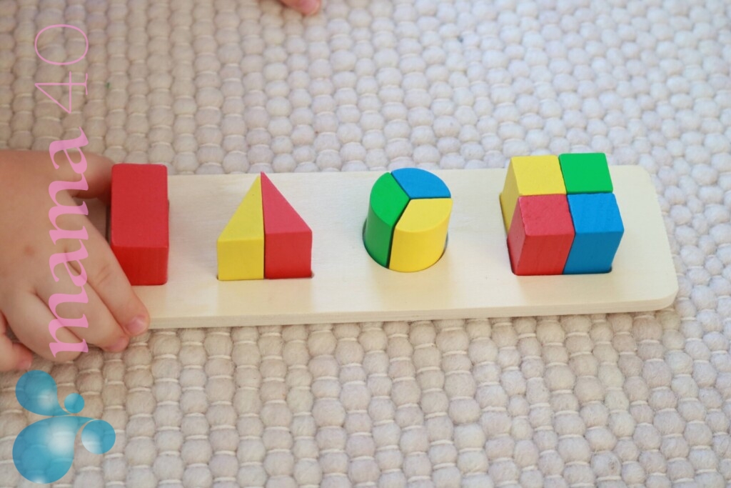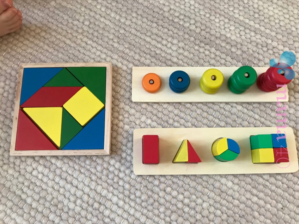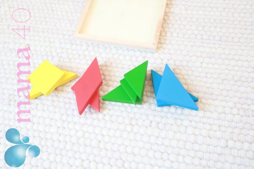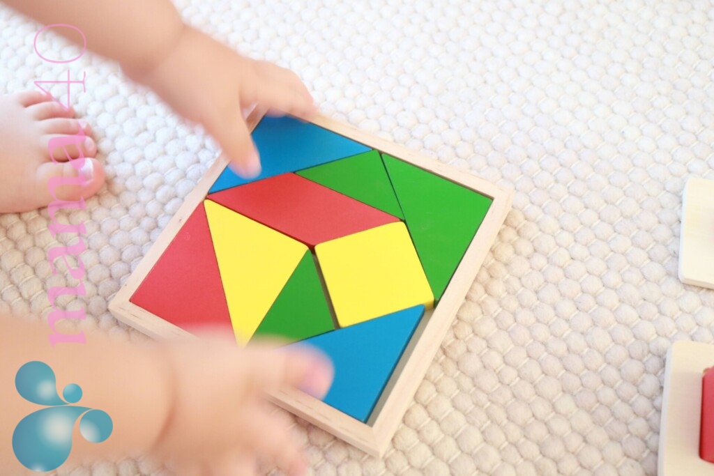 タングラムは1歳2歳の子どもにはまだ難しくて仕上げることはできませんが、ブロックを色ごとに分けるなど、よいお仕事をしていました。