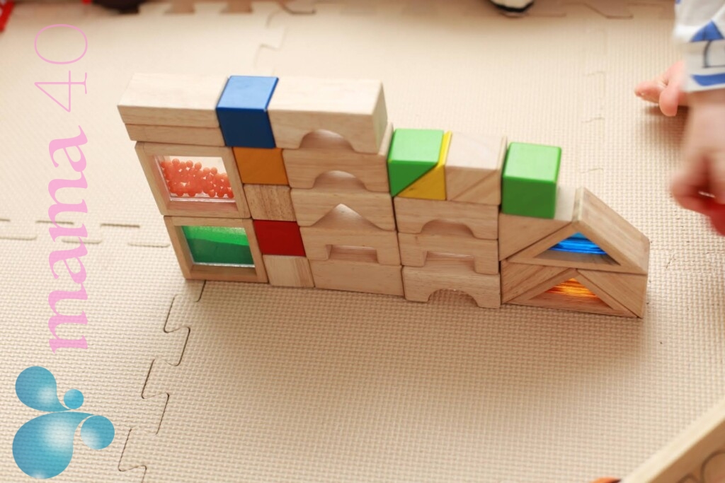もし、定番の積み木を使う場合は、音が鳴ったり、積み木の中が透明になってて透かして見える物、形にバラエティがあるものなどおすすめです。