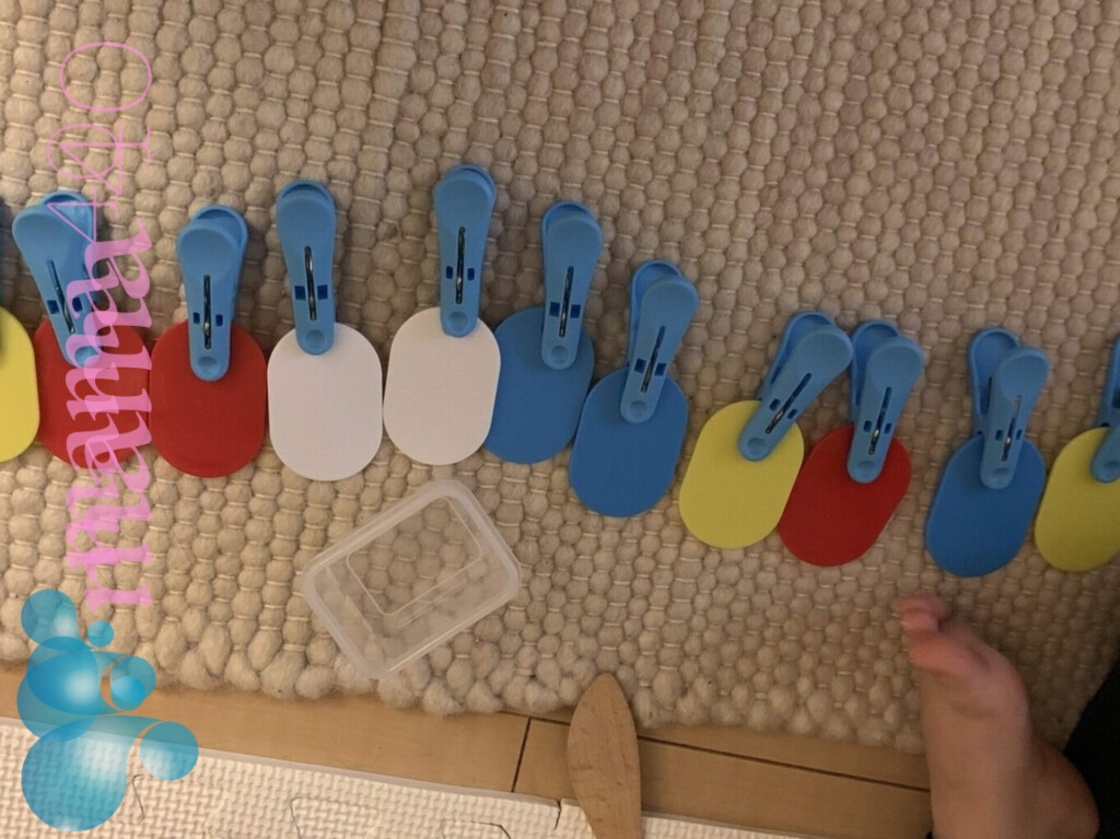 遊び方:洗濯バサミをつまむのは、1歳2歳の子どもには少しコツが入ります。2つの指を使い、どの向きに力を入れたらよいのか。さらに洗濯バサミに何かをはさむ時に、指から離すタイミングなど。最初はうまくいきません。じっくり時間をかけて見守ってあげる必要があります。ですが慣れてきた時の喜びはとても嬉しいものです/番号札をはさんだり、何かに挟みながら並べたり。子どもの想像力のまま遊ばせてみましょう。