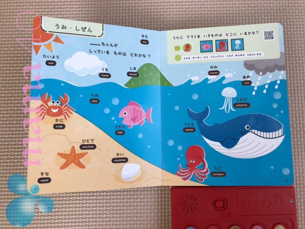 工夫されたエデュトイで遊んだり、映像を見ているうちに、いつの間にか「どうぶつ」「のりもの」「たべもの」「うみのいきもの」などに関することばを、とても自然に日本語も英語も聞き取れて、まねして言えるようになってしまうのです★彡