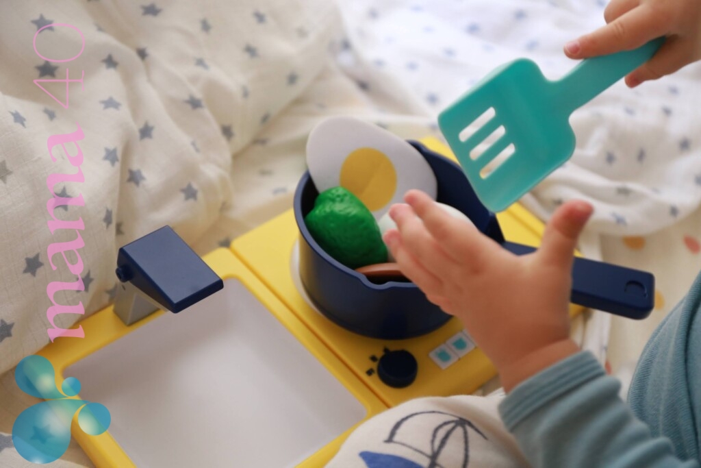 「おしゃべり知育キッチン」は、キッチン自体がおしゃべりしてくれるので、親の出番は最小限で済むかもしれません。ひとり遊びも楽しんでました。