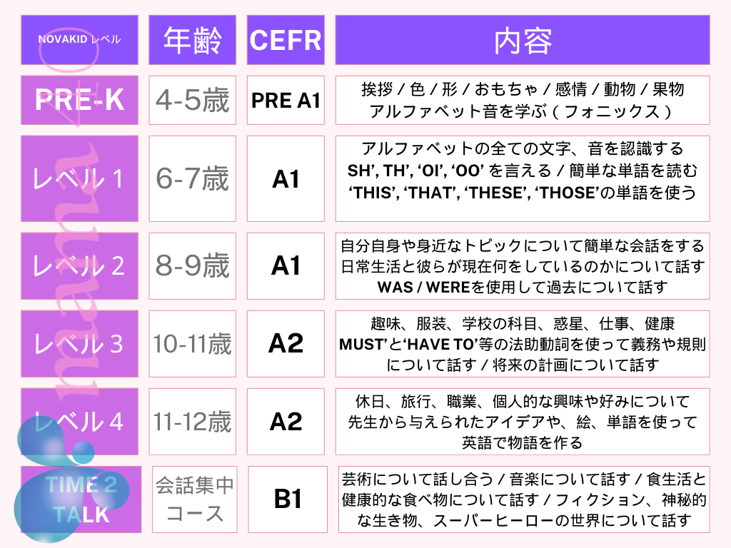 そして、ノバキッドのレベルの指標である、CEFR基準のカリキュラム。